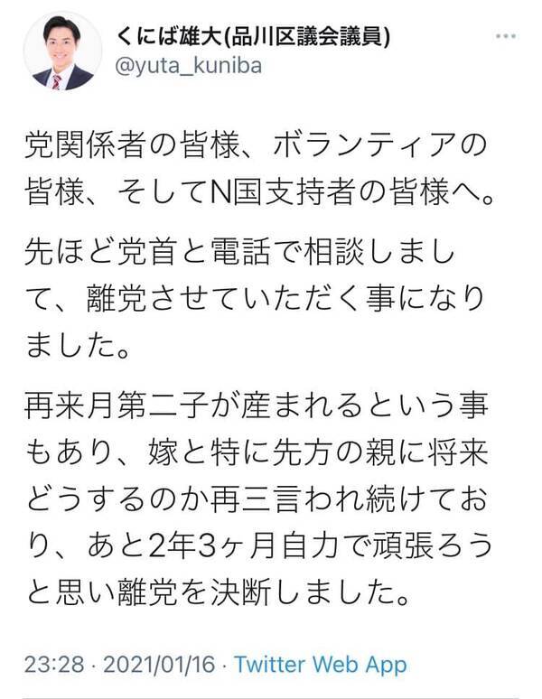 ニコ生主のnerさんこと國場雄大 品川区議がn国党離党を表明 嫁と特に先方の親に将来どうするのか再三言われ続けており 2021年1月17日 エキサイトニュース